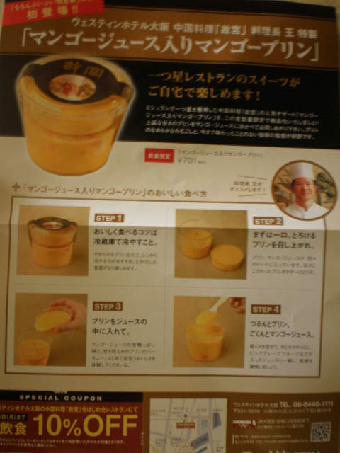 西宮阪急で5月4日までMBS(毎日放送テレビ)の「ちちんぷいぷい物産展」開催中です! 本日は閉店間際だったので、色々と完売続出  そんな中、気になったマンゴージュースプリンを買ってきました! 700円也。 ウェスティンホテル大阪 中国料理 故宮 ミシュランで1つ星のレストランだそうです~   見た目は・・・タピオカ入りのマンゴープリン?といったところです。 ふたを開けてみると・・・マンゴープリンとジュースが分かれてる  そして、プリンを一口・・・さっぱりして、マンゴーの味が強烈な後味  ジュースだけだと・・・これまたプリン以上にさっぱりしていて、タピオカや果肉のプチプチ感が気持ちいい  そして、プリンをジュースに入れ込みます・・・ マンゴーはじめ果肉の味がグッと際立ちますね  濃い中華料理の後に食べると絶品なんだろうなぁ   取説もわかりやすいです  ゴールデンウイークなので、結構な人手が予想される西宮阪急&阪急西宮ガーデンズですが、スペシャルウイークにスペシャルスイーツをチョイスするのも楽しいかもしれません! 西宮阪急 ちちんぷいぷい物産展 PR