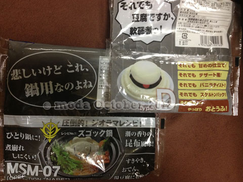 10月3日に発売された、新しい豆腐戦士たちをご紹介。 「鍋用!ズゴックとうふ」&「ザクとうふデザート仕様 typeD」 相模屋食料株式会社 群馬県前橋市鳥取町123 今回もダイエー夙川店で発見して、速攻でカゴに入れちゃいました。 ザクとうふの記事はこちら 袋の裏面も面白いんですよねぇ。 ズゴックとうふは鍋攻略専用(悲しくはないですよ)、ザクとうふtypeDは砂漠専用(デザートだけに)ということです。 そしてパッケージがこちら。ニヤニヤしますよね、まったく。パッケージから出すとよくわかんない形になるんですけどねー。 ズゴックは海藻(サイトによると昆布らしい)の風味が濃い!カツオだしの鍋に入れちゃったけど、それはそれで良かったなぁ。ザクとうふのバニラ風味もなかなか。でもザクとうふのイメージとは違うかな・・・。 年1個でいいから、仲間がどんどん増えると嬉しいです! PR