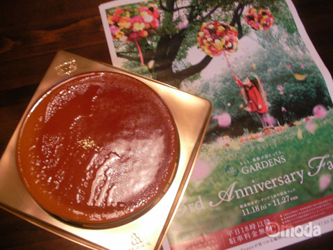 そういえば、11月17日は西宮阪急を含む阪急西宮ガーデンズの3回目のお誕生日でした ![]() 2008年にオープンしてからずっと通ってますが、早いモンですねぇ。 阪急西宮ガーデンズ 兵庫県西宮市高松町14−2 というか、今年は周年お知らせのお葉書…読まずに食べちゃったみたいで、お祝い期間をすっかり忘れてました。3周年のお祝いは27日までです。 これまでのお祝い記事たち。 西宮阪急 開店1周年記念 阪急西宮ガーデンズ 開店2周年 その他、ガーデンズのプレオープン時には動画まで撮ってました。 西宮阪急やガーデンズのお店の中で見かける「All Happy」と書かれたクローバーのマーク が、今回のお祝いショッピングの目印です。期間中のみお安くなっていたり、特別セットが組まれていたりするみたい。だけど…クローバー・マークは見かけても、どの商品が対象商品なのかわかりづらいお店もあるので要注意です ![]() 結局、わかりやすくて美味しそうなmorozoff(モロゾフ)のプリントルテを買ってきました! モロゾフ 西宮阪急 フロアマップ 1260円也。直径はかなり大きくて20センチ弱ってとこでしょうか。 高さは5センチ前後?!なかなか平べったいスイーツなんです。 早く食べたくてぶれた ![]() 最上部はモロゾフならではの甘いカラメルソース、その下はプリンというよりプリン風味のムースって感じかな。意外とあっさりしています。しっかりしたタルト部分も美味しい ナイフで切るよりスプーンでガバガバすくいたい![]() やっぱりモロゾフのプリンが好きだー ![]() しかしまあ、大人しい3周年のお誕生日です。5周年になったら盛大なお祝いするのかな?もちろんお祝いじゃなくても通いますけどね ![]() PR