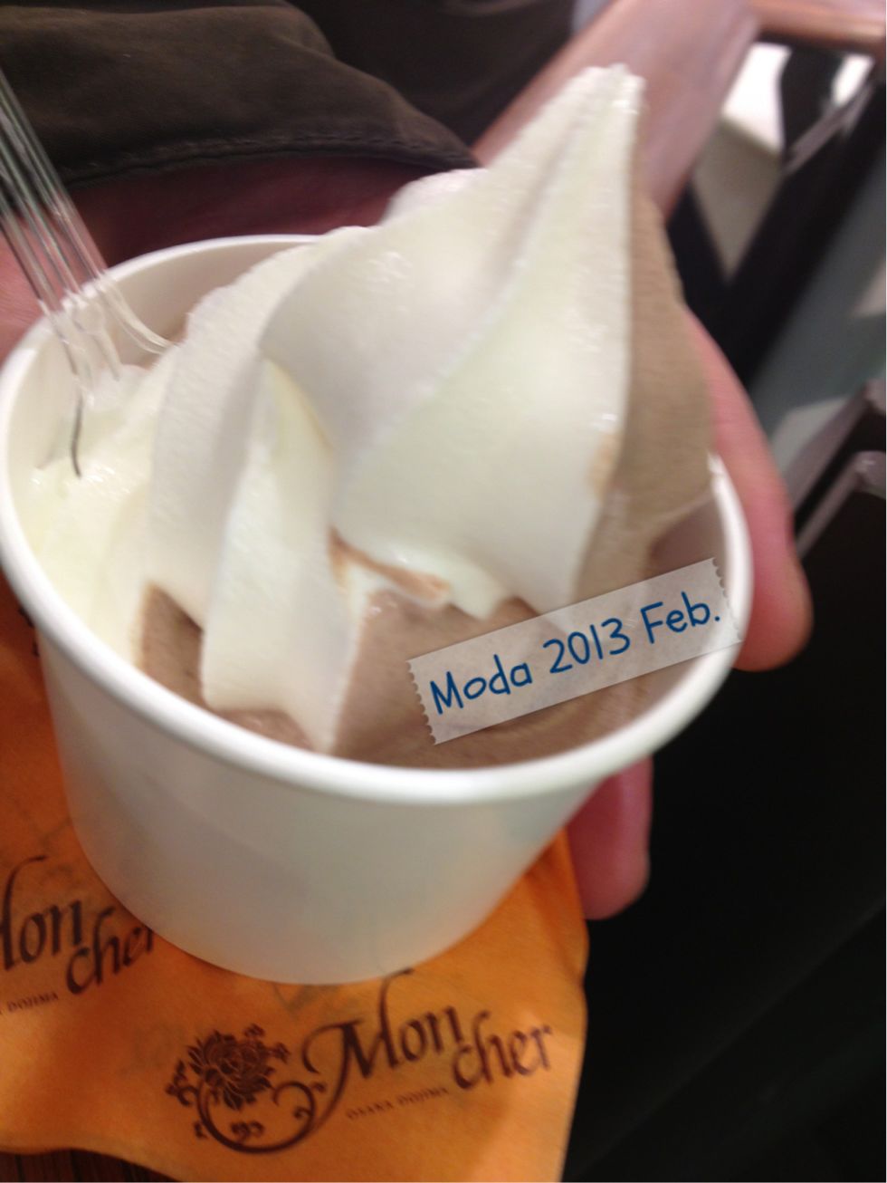 んまぁ、バレンタインだし、すごい人でした。 疲れた時でもあちこちで休憩できるのが、うめだ阪急の良いところ。 初めて、モンシェールのソフトクリーム(しかもミックス)をチョイスしてみました。 315円也。濃いチョコとあっさりミルク。プレーン(ミルクだけ)も頼めば良かったかなぁ(・・;)