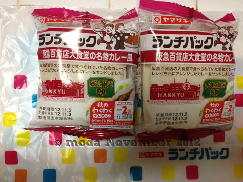 見たかった場所の1つ、地下1階と地下2階は、とりあえず端から端まで歩いてみました。 今までの2倍?それ以上??とにかく、人が多いこともあって、なかなかたどり着けないほどのフロア面積になってました! あちこちで行列ができていたのですが、並ぶ気にはなれず・・・ すると、どこからともなく青い車がやってきたので、早速買ってみました。 ランチパック 阪急百貨店大食堂の名物カレー風 平成14年まで販売されていた「大食堂の名物カレー」のレシピを元に作ったランチパック!カラーリングも阪急:) 1個201円也。 実は阪急百貨店の大食堂で食べたことないんだけど懐かしい味です。 広いフロアだからとて、ランチパックを山盛り載せたミニミニトラックで来るかねぇ。めっちゃくちゃ嬉しかったけど! [追記 2012/11/20] 次に行った時も、同じ場所に青い車が止まっていました・・・どこからともなく“やってきた”わけではなくて、人ごみをかきわけて“私が近づいていった”だけのようです。失礼しました。