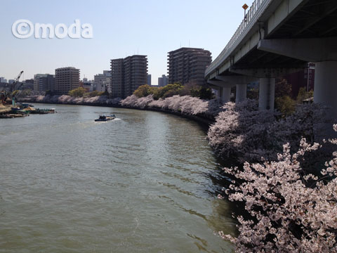 阪急・谷町線の天神橋筋六丁目駅から歩いて10分足らず。都島大橋から西を眺める、の図。 大川の護岸工事もしていて、ちょっと無粋な箇所もありますが、この桜並木が何キロも続いているそう。高層ビルと高速道路と桜の構図は圧巻です。