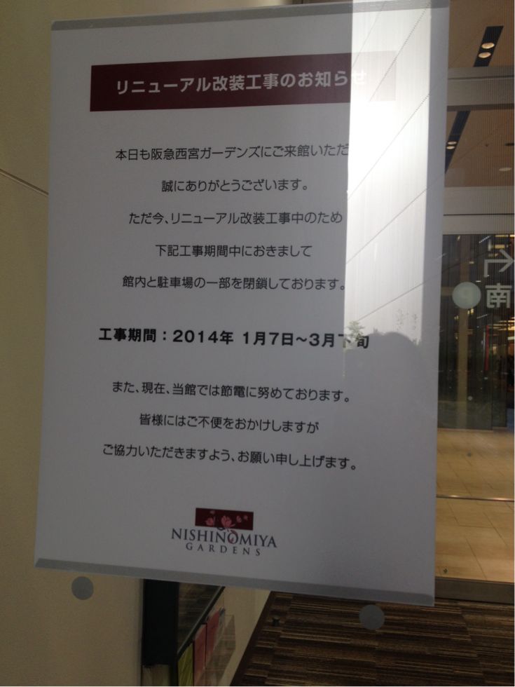もう、あちこちでリニューアルのシーズンですねえ。 こちらは、ららぽーと甲子園。 こちらは、阪急西宮ガーデンズ。 三階から下を覗くと、移転や何やでクローズの店が多いです…やっぱり寂しい。 でも、あちこちで新店舗の宣伝が出始めでいて、期待もどんどん高まるってものです、