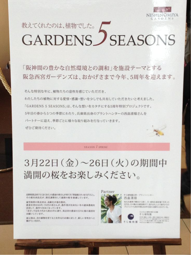 ちょっと慌てて夙川にいきましたが、本当にちらほら・・・まだ1分咲き、2分咲きといった感じで、一安心しました。 いつ咲き誇るかわからないのが、桜の悩ましいところではありますが・・・ で、阪急西宮ガーデンズにいってみると、巨大なオブジェが!! 阪急西宮ガーデンズ 兵庫県西宮市高松町14−2 2階の入り口入ったところにドドーンと満開の桜が。 5周年を迎えるにあたって、季節ごとに植物を使ったプロジェクトを展開するそう。 3月26日までは、満開の桜を(関西では)一足お先に楽しめます。